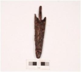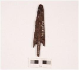 | Description / विवरण | A iron arrowhead, top is pointed and sharp, surface is rusted and rough with tang and base. |