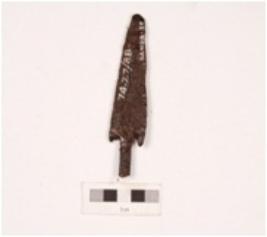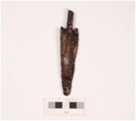 | Description / विवरण | A iron arrowhead, tip is pointed, crack on surface and rusted with a tang. |