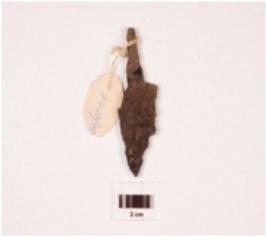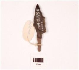 | Description / विवरण | A fragment of iron arrow head, pointed ends surface is uneven and rusted with a long tang. |