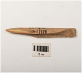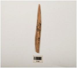 | Description / विवरण | A bone point made on a long bone, slightly damaged from the surface. |