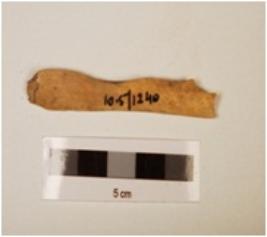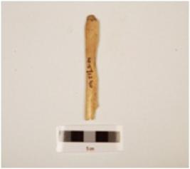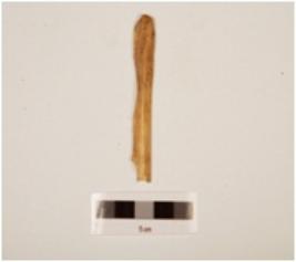 | Description / विवरण | Fragment of bone point, slightly uneven in shape, flat from inside, ridge on other side, broken from bottom, polished surface, off white in colour. |