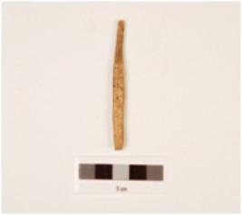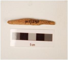 | Description / विवरण | Fragment of bone point, uneven in shape, slightly uneven ends, rough surface, black pigmentation is visible. |