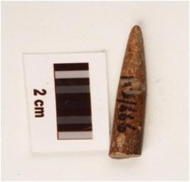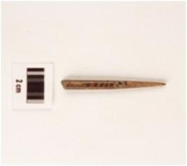 | Description / विवरण | Fragment of bone point, highly polished, brownish in colour, pointed one end, circular cross section and other end broken. |