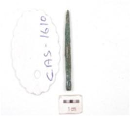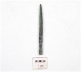 | Description / विवरण | Fragment of copper hook, one end pointed, circular cross section and green incrustation on surface. |
