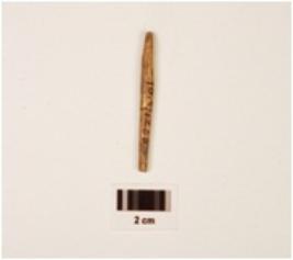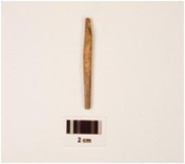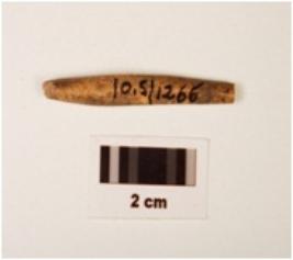 | Description / विवरण | Fragment of bone point, broken top, oval end, round in shape, thin in character, polished, black pigmentation on surface. |