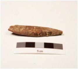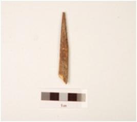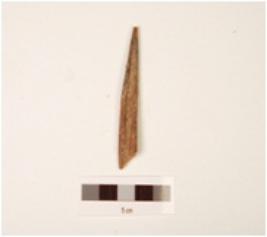 | Description / विवरण | Fragment of bone point, pointed top, slightly flat surface, broken from bottom, rough surface, groove inside. |