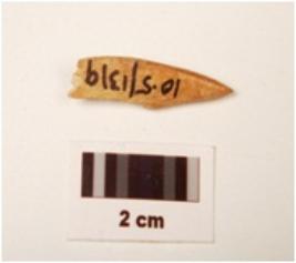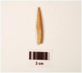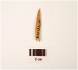 | Description / विवरण | Fragment of bone point, pointed top, broken from bottom, triangular surface, chipped off from edges, rough surface, brown in colour. |