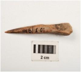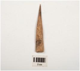 | Description / विवरण | A bone point made from bone, smoothly polished both surface, pointed at both ends. |