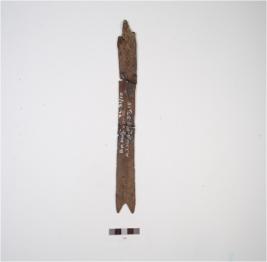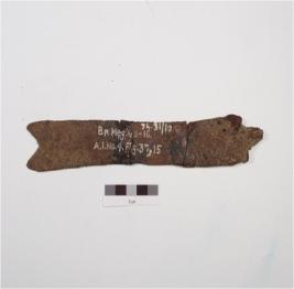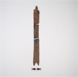 | Description / विवरण | Fragment of and iron spear head with two pronged at one end and a broken tang at the other it has rusted surface. |