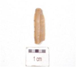 | Description / विवरण | Chert blade, prepared platform, prominent bulb and use-wear marks along the cutting edge, trapezoidal cross-section and one end broken. |