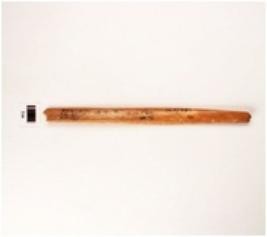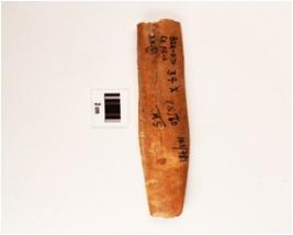 | Description / विवरण | Fragment of bone chisel, both ends broken, smooth and polished surface, plain upper side, other side grooved and cracks on surface. |