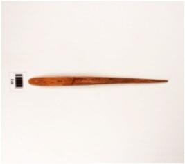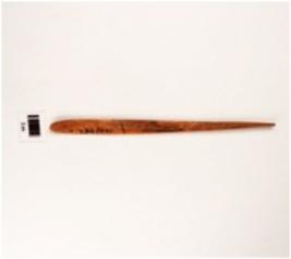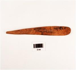 | Description / विवरण | Bone point with flat surface, partly damaged point, mended surface, smooth polished, surface rectangular in section and convex one end. |