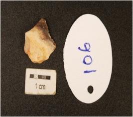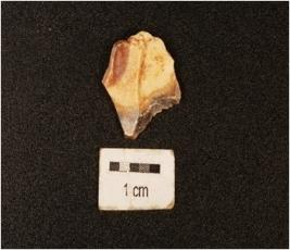 | Description / विवरण | A chert flake with two flake scars on surface, diffused bulb and prepared platform. |