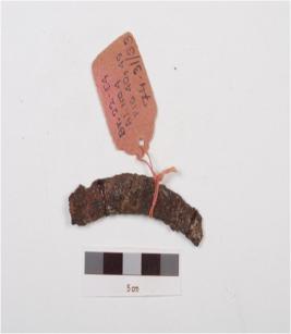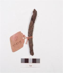 | Description / विवरण | Fragment of an iron sickle, slightly rusted surface, mended at both the ends. |