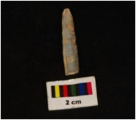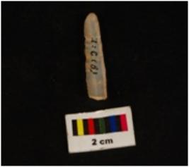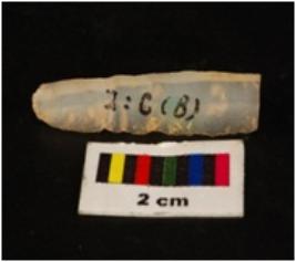 | Description / विवरण | Parallel sided chalcedony blade, mid- ridge on dorsal, flat ventral, proximal end, deffused bulb, use wear marks. |