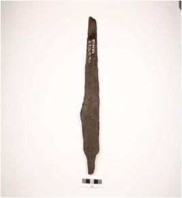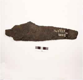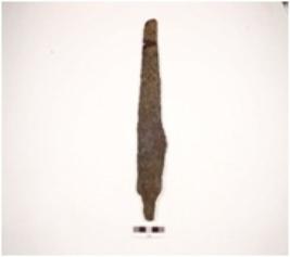 | Description / विवरण | Fragment of tanged arrow head made of iron with rough surface chemically treated. |
