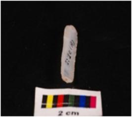 | Description / विवरण | Parallel sided blade on chalcedony with double ridge on dorsal side, diffused bulb on ventral side, trapezoidal section, regularly retouched right cutting edge of dorsal side and the distal end broken. |