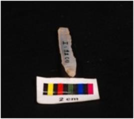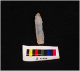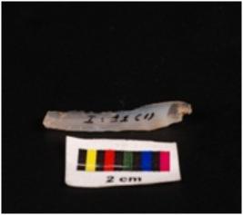 | Description / विवरण | Chalcedony parallel sided blade with two ridges, regularly retouched edges, diffused bulb of percussion and distal end broken. |