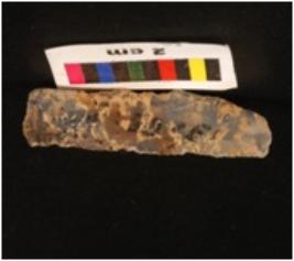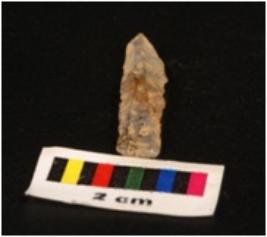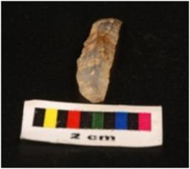 | Description / विवरण | Chalcedony parallel sided blade with a double ridges, regularly retouched edges, uneven broken ends. |