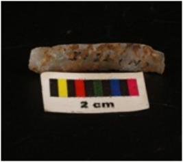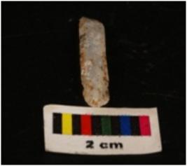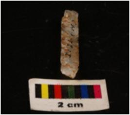 | Description / विवरण | Microlithic blade with use-wear marks on cutting edge, prominent ridges on dorsal surface, with bulb on proximal end. |