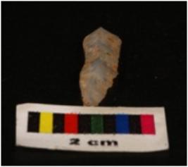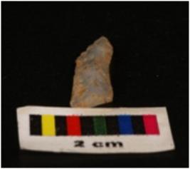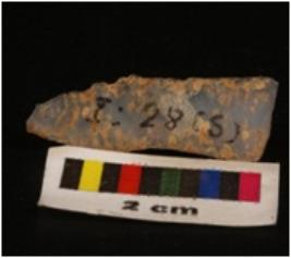 | Description / विवरण | Parallel sided blade with one weavy and another sharp cutting edges, broximal end is broken, vertical visible ridge on dorsal surface, concave ventral surface. |