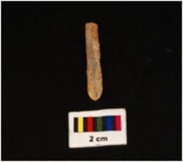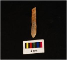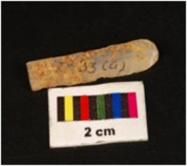 | Description / विवरण | Parallel sided blade, ridges along the mid part of dorsal surface, retouches along working edges, broken distal end both dorsal and ventral part straight. |