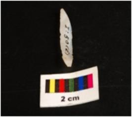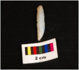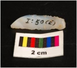 | Description / विवरण | Blade made of chalcedony flake scars on the dorsal side. Two working edges are retouched. Both the proximal and distal ends are broken. |