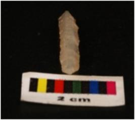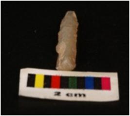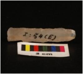 | Description / विवरण | Parallel sided blade with weavy cutting edges, diffused bulb with striking platform at proximal end, distal end is broken, retouched ridge on dorsal surface, concave ventral surface. |