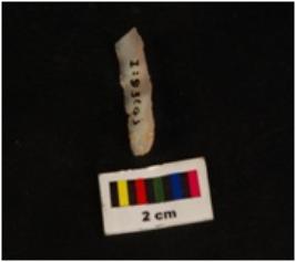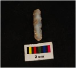 | Description / विवरण | Parallel sided chalcedony blade, two ridges on dorsal, flat ventral, use wear marks, irregular edges. Proximal end, distal end from top. |