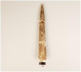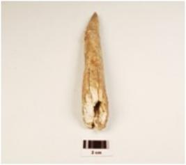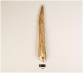 | Description / विवरण | Fragment of bone point, well polished, broken and mended and cracks visible on surface. |