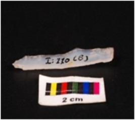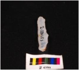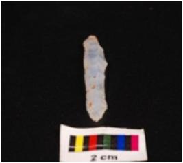 | Description / विवरण | Pen knife blade, made up of chalcedony stone, two ridge on dorsal surface, ventral surface is smooth and one end is pointed, edge are retouched. |