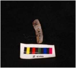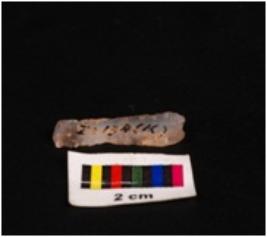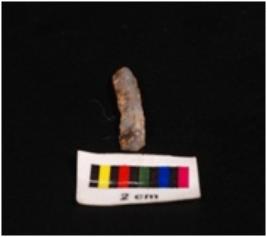 | Description / विवरण | Chalcedony parallel sided blade with a single ridge, triangular section and use wear marks on the edges |