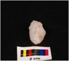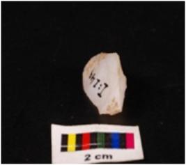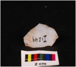 | Description / विवरण | Chalcedony blade with a single mid-ridge on dorsal side, diffused bulb on ventral side, triangular section and distal end broken. |