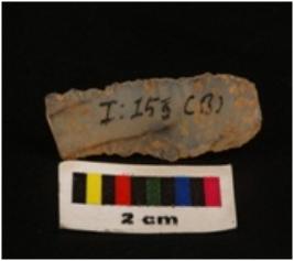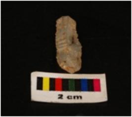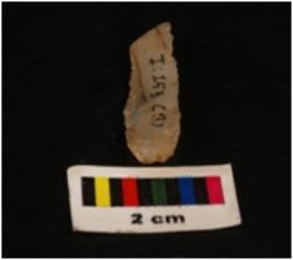 | Description / विवरण | Microlithic blade with use wear marks on cutting edges, prominent mid-ridge on dersal surface, bulb on proximal end with triangular section. |