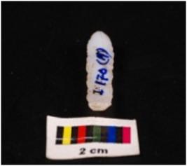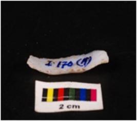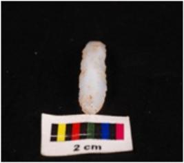 | Description / विवरण | Parallel sided blade on chalcedony with double ridge on dorsal side, trapezoidal section, diffuse bulb on ventral side, use wear marks on cutting edges and distal end broken. |
