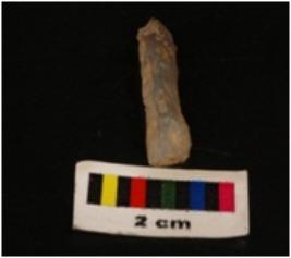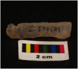 | Description / विवरण | Parallel sided microlithic blade with use wear marks on cutting edges and prominent mid ridge on darsal, bulb on proximal end. |
