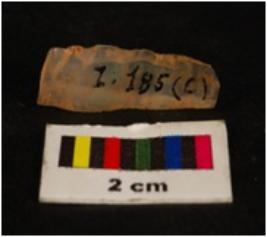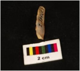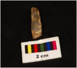 | Description / विवरण | Parallel sided chalcedony blade, mid-ridge on dorsal, flat from ventral, proximal end. Use wear edges. |