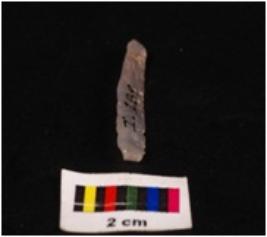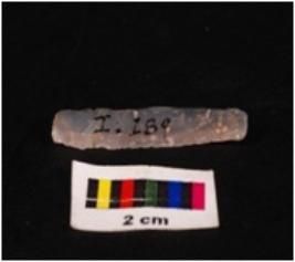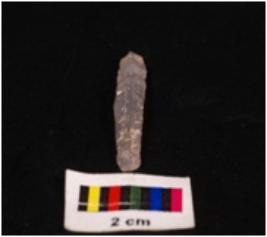 | Description / विवरण | Parallel sided blade on chalcedony with a single mid-ridge on dorsal side, triangular section, diffused bulb on ventral side and use- wear marks on cutting edges. |