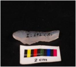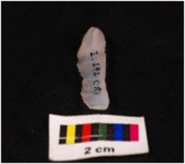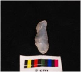 | Description / विवरण | Parallel sided blade on chalcedony with a single mid-ridge on dorsal side, diffused bulb on ventral side, regularly retouched edges and the distal end broken. |