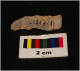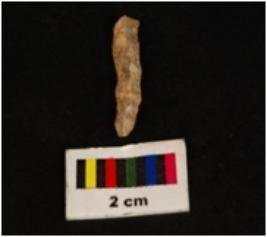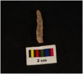 | Description / विवरण | Pen knife shaped chalcedony blade, irregular dorsal, flat ventral, proximal end, slightly blue in colour. Use wear edges. |
