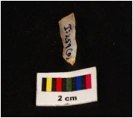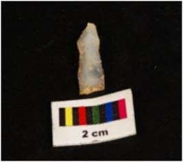 | Description / विवरण | Parallel sided microlith blade with use wear marks on cutting edges and prominent mid ridge on doral. Triangular in section. |
