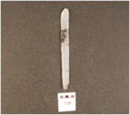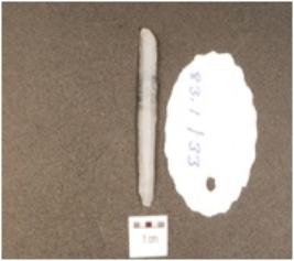 | Description / विवरण | A chalcedony blade, flake scars on the surface, diffused bulb on the ventral side, prepared platform on the proximal end, distal end intact and partly retouching on the cutting edges. |