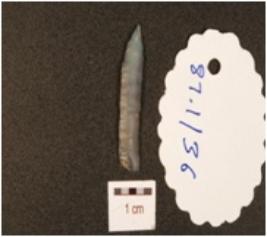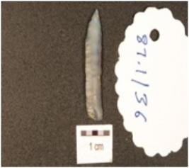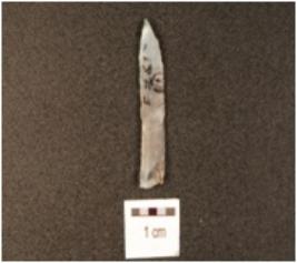 | Description / विवरण | A chalcedony blade, flake scars on the surface, prepared platform on the proximal end and distal end pointed and partly retouching on the cutting edges. |