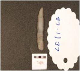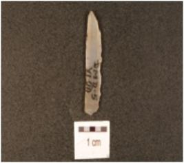 | Description / विवरण | A chalcedony pen knife blade, flake scars on the surface, platform on the proximal end, distal end pointed and partly retouching on the cutting edges. |