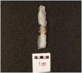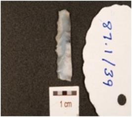 | Description / विवरण | Fragment of chalcedony blade, flake scars on the surface, prepared platform on the proximal end, diffused bulb on ventral side and distal end broken. |