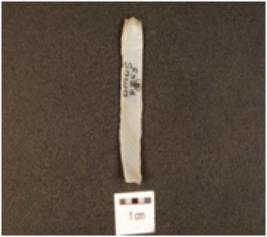 | Description / विवरण | A chalcedony blade, blade scars on the surface, diffused bulb on the ventral side, prepared platform on the proximal end and partly retouching on the cutting edges. |