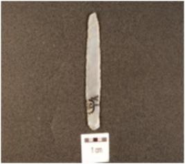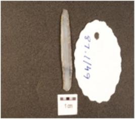 | Description / विवरण | A chalcedony blade, blade scars on the surface, prepared platform on the proximal end, diffused bulb on the ventral side, prepared platform on the proximal end and partly retouching on the cutting edges. |