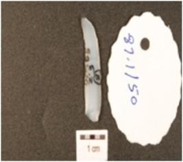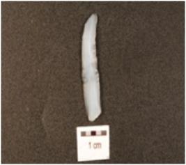 | Description / विवरण | A chalcedony pen knife blade, flake scars on the surface, prepared platform on the proximal end, distal end pointed, prominent bulb on the ventral side and partly retouching on the cutting edges. |