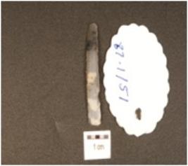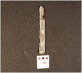 | Description / विवरण | A chalcedony blade, blade scars on the surface, prepared platform on the proximal end, distal end blunt and partly retouching on the cutting edges. |
