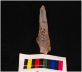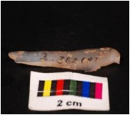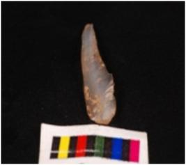 | Description / विवरण | Parallel sided blade with one concave and another straight sharp cutting edge, use-wear marks are present, flake scars on dorsal surface, concave ventral surface, intact proximal end, broken, pointed distal end. |